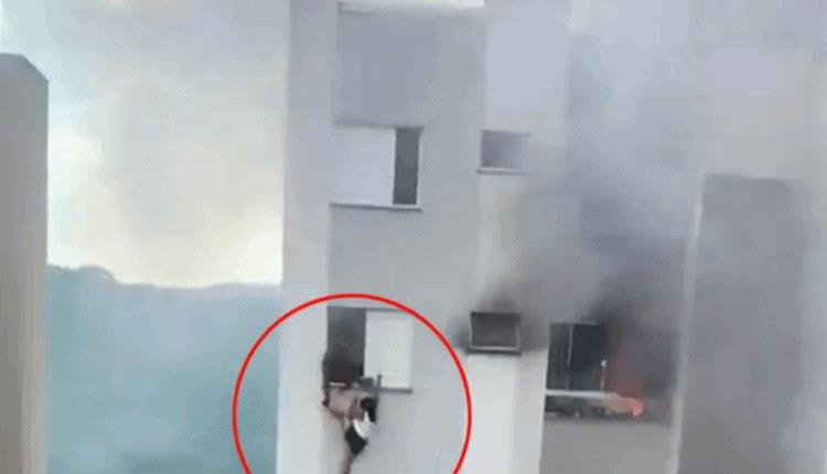 ويُظهر المقطع أولاً المرأة البالغة من العمر 53 عامًا، وهي تخرج من نافذة الطابق الثالث هربًا من الحريق الذي أشعلته حفيدتها البالغة 11 عامًا، بعد أخذ هاتفها.