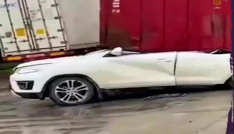 ووقعت الحاوية الضخمة على السيارة فضغطتها، وأظهر فيديو آخر السائق وهو مغشي عليه داخل السيارة تحت الحاوية.